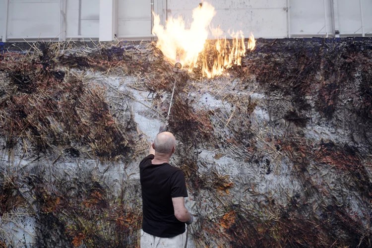 Donc, Wenders offre au spectateur des images, toutes plus belles les unes que les autres, des oeuvres gigantesques (dans tous les sens du terme) de Kiefer, des espaces où il travaille et entrepose ses pièces monumentales (dans tous les sens du terme), de son musée à ciel ouvert de Barjac (Gard), de son travail au quotidien, avec parfois l’aide d’une équipe. On suit Kiefer, sur un vélo, alors qu’il traverse son « atelier » de Croissy pour des raisons qui peuvent paraître obscures, on le regarde travailler, à la spatule ou au lance-flamme sur des toiles dont on ne saurait dire quelle dimension elles peuvent bien faire. Bref, on est immergé dans la pratique du maître, sans chercher nécessairement à tout comprendre, le film se transforme bien vite en expérience sensorielle, que des images d’archives (qui permettent de revenir sur une carrière déjà vieille) et quelques scènes biographiques (presque fictionnelles) viennent tempérer. C’est lent, c’est absolument magnifique, c’est un regard d’artiste sur le travail d’un autre artiste, c’est presque une déclaration d’amour. Les processus de création de Kiefer sont peu à peu dévoilés, et son travail apparaît alors comme une forme d’industrie artistique (ce n’est pas tout à fait par hasard s’il installe parfois ses ateliers et ses entrepôts dans d’anciennes usines), ce qui n’empêche en rien que grand nombre de ses pièces sont d’une poésie et d’une légèreté inouïe alors que leur format est souvent monumental. Le nombre de ces pièces laisse rêveur, et on en viendrait presque à se demander comment il est possible à un seul homme de créer autant (quantitativement) sans avoir passé une sorte de pacte avec le diable ! Le film suscite l’admiration, le film lui-même est admirable, et la musique qui accompagne les images, signée Leonard Küßner, y contribue grandement. Comment rendre compte de pareilles oeuvres sans se sentir démuni, en manque de vocabulaire et de syntaxe pour dire l’indicible ?